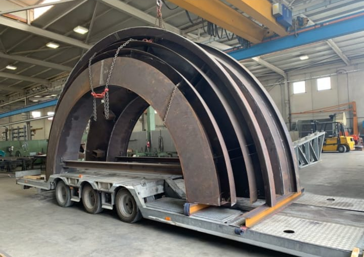 I due semicerchi della pesante struttura in ferro saranno trasferite nel Lazio dove una ditta si occuperà dell’operazione di zincatura, alla quale sono state già sottoposte le dodici colonne vuote a sezione rettangolare che vi andranno saldate.
